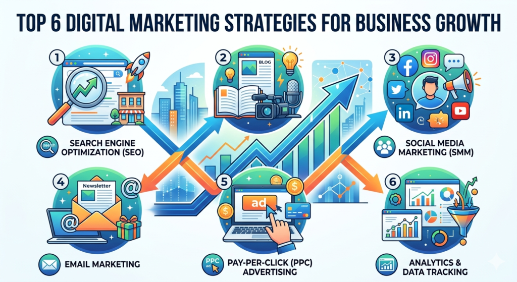 Digital marketing is the practice of promoting products, services, or brands using online channels and digital technologies. It includes strategies like search engine optimization (SEO), social media marketing, email marketing, content marketing, and paid advertising to reach a targeted audience, drive traffic, generate leads, and grow business online.